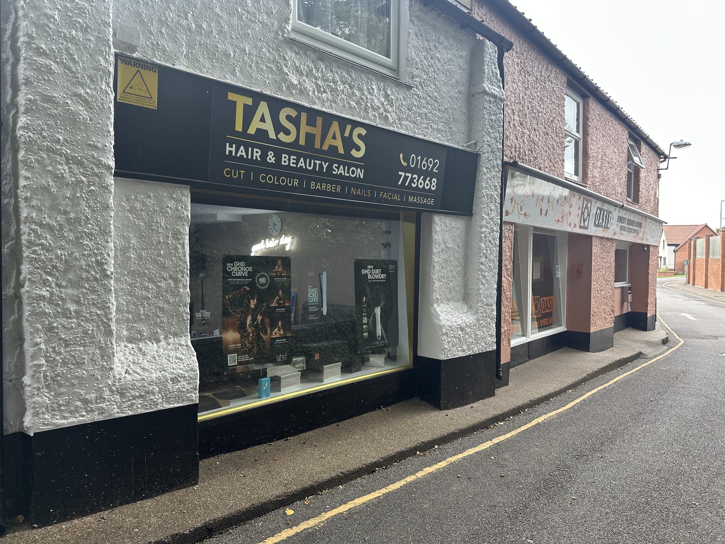 Large accessible hair, barbering, beauty and tanning salon with ramp access can even accommodate electric scooters.